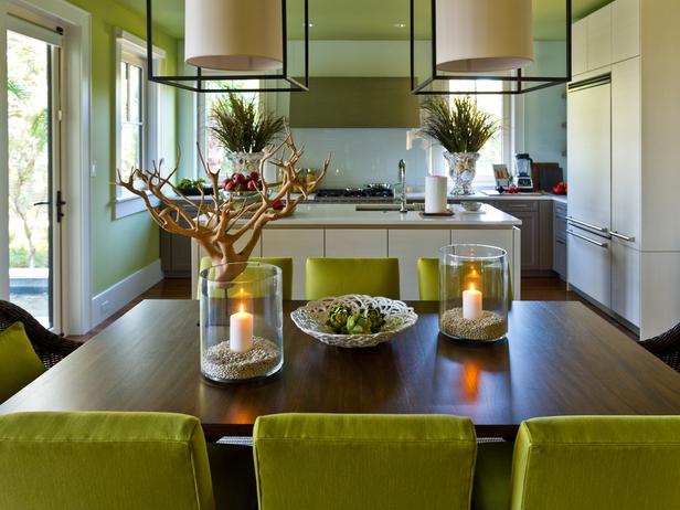 Open to both the great room and kitchen, the casual chic dining area commands attention through thoughtful use of eye popping accessories, including a teak wood sculpture purchased in Mount Pleasant, S.C., and cage-shaped chandeliers. "You don't have a place for artwork, a big mirror or a piece of furniture," says interior designer Linda Woodrum. "So you are looking for ways to do more than just chairs, a table and a rug."