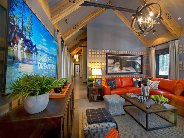 This light filled family room is packed with color, comfort and plenty of style. High ceilings, exposed wood beams and a magnificent view epitomize modern mountain living, while cozy seating, a giant flat-screen TV and a warm color palette make this room the perfect place to bundle up for casual entertaining.